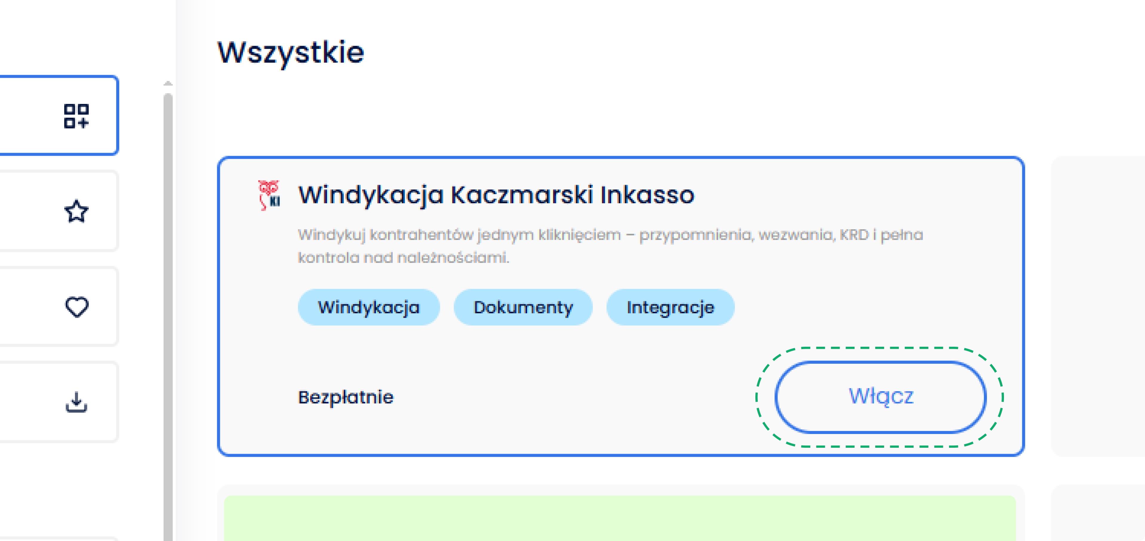 - Przejdź do Ustawień – Marketplace – Windykacje Kaczmarski Inkasso – Naciśnij przycisk “Włącz”