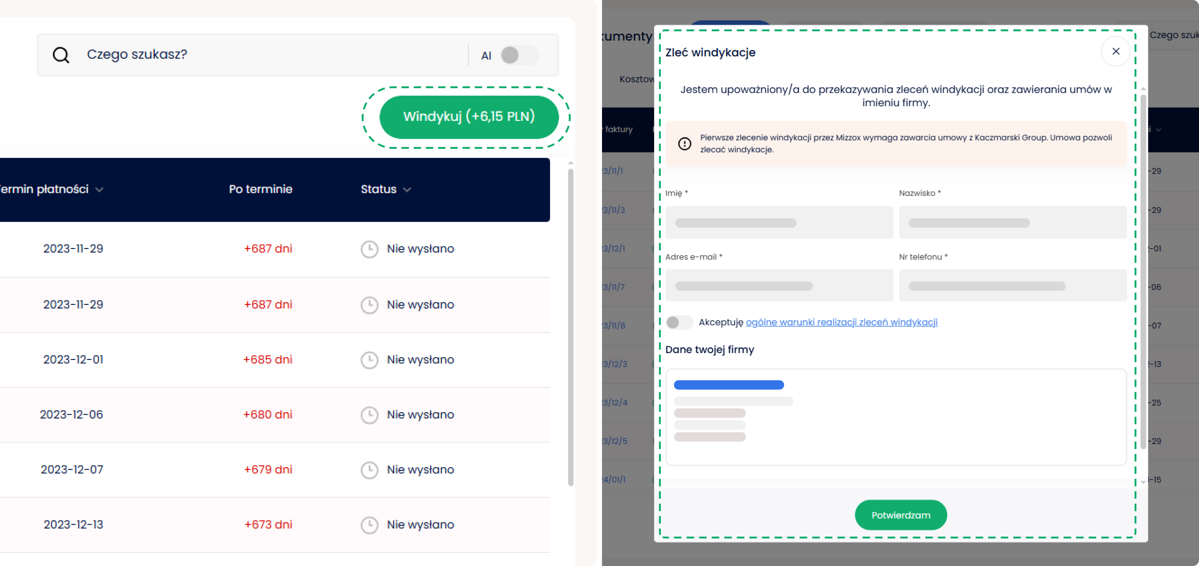 Aktywacja modułu windykacji Kaczmarski Inkasso odbywa się w pełni online, bezpośrednio w systemie Mizzox. Proces ten wymaga zawarcia umowy, co dzieje się automatycznie poprzez przekazanie danych wewnątrz naszej platformy – nie ma potrzeby podpisywania fizycznych dokumentów.