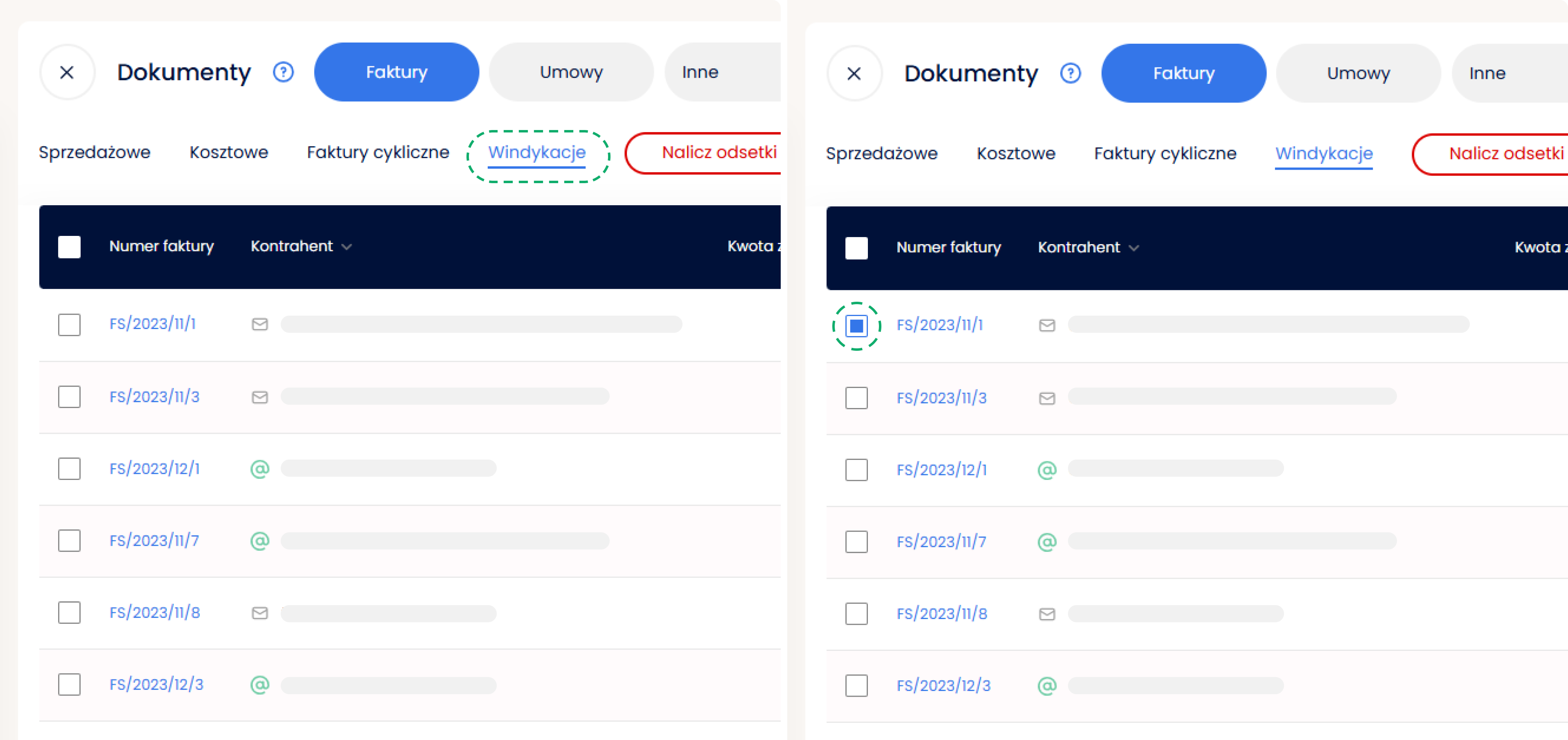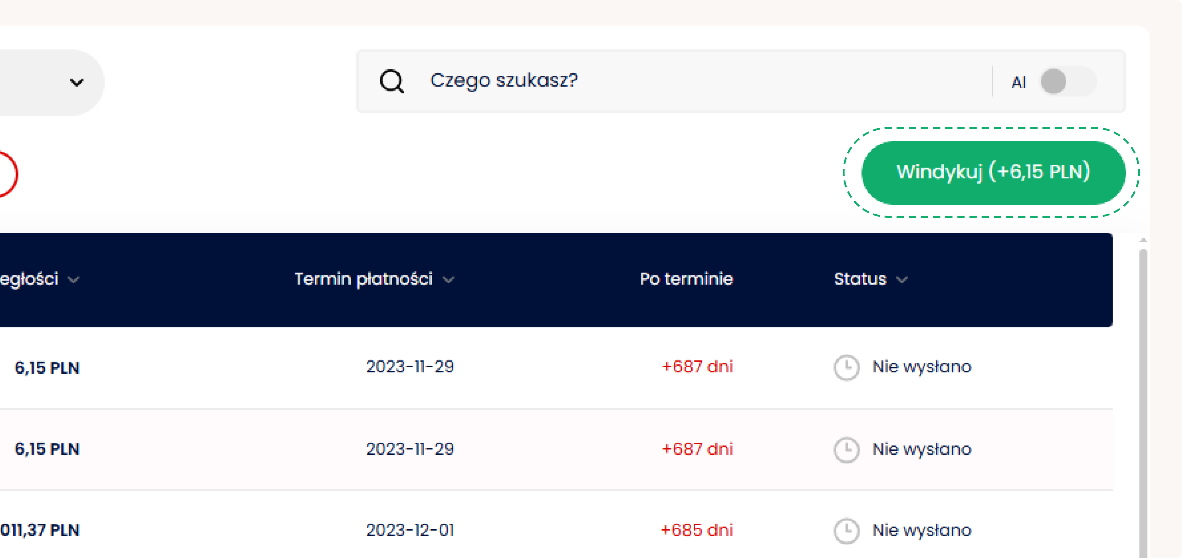 - Po włączeniu integracji możesz od razu przekazywać sprawy do windykacji z poziomu modułu Dokumenty. Opcja ,Windykacje’ pojawi się tuż obok faktur kosztowych.