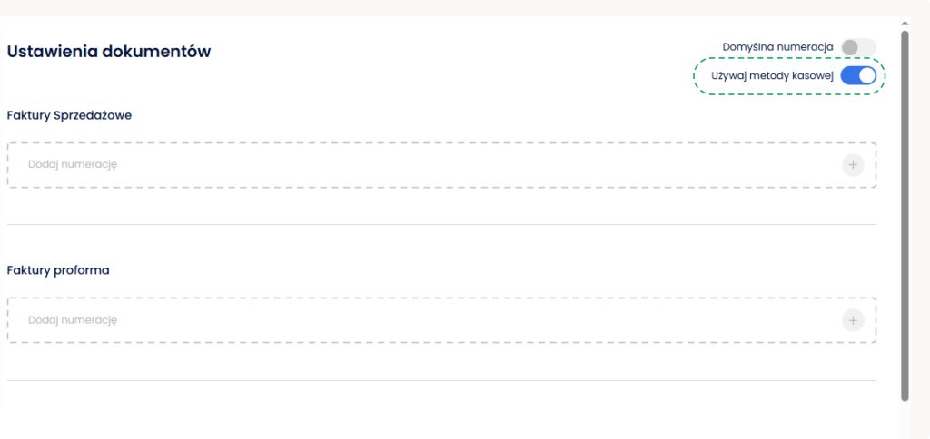 Aby wystawić fakturę metodą kasową, należy przejść do Ustawień, a następnie do sekcji Dokumenty – Ustawienia dokumentów. W prawym górnym rogu zaznaczamy pole ,Używaj metody kasowej’.
